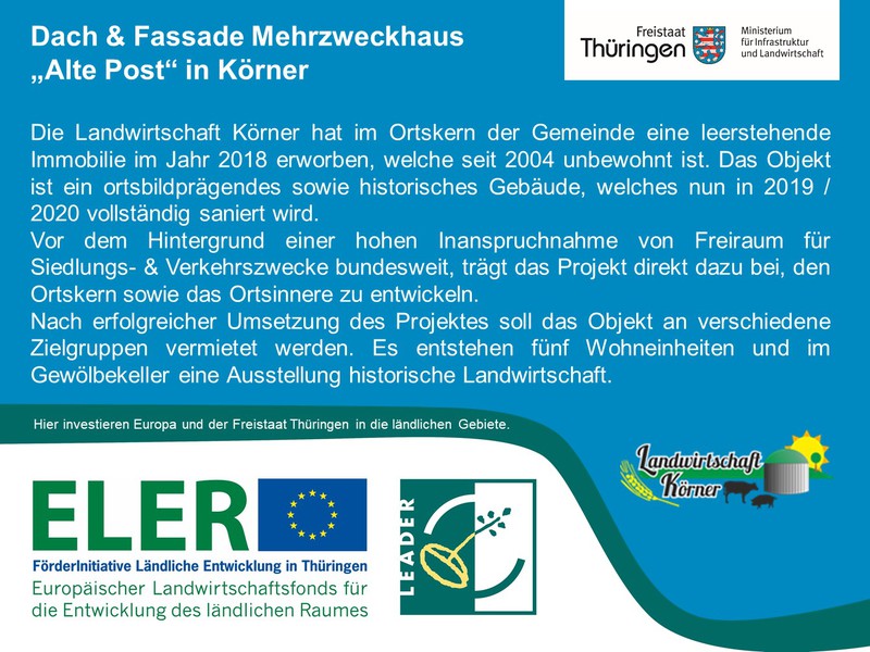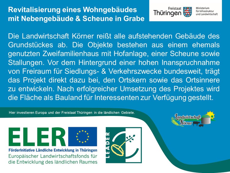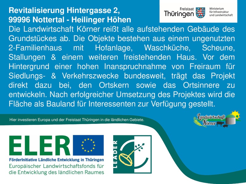 Mit dem Bau der Ortsumgehung Mühlhausen wurde ein Landschaftspflegerischer Begleitplan erarbeitet sowie beschlossen. Der Plan sieht vor, dass eine Fläche von ca. 30.000qm nach Bewirtschaftungsgrundsätzen zu bearbeiten ist. In Umsetzung hat die Landwirtschaft Körner mit der Bundesrepublik Deutschland, vertreten durch die DEGES, eine Vereinbarung über die Ausgleichsmaßnahme A7 (Feldhamsterfläche) getroffen.
